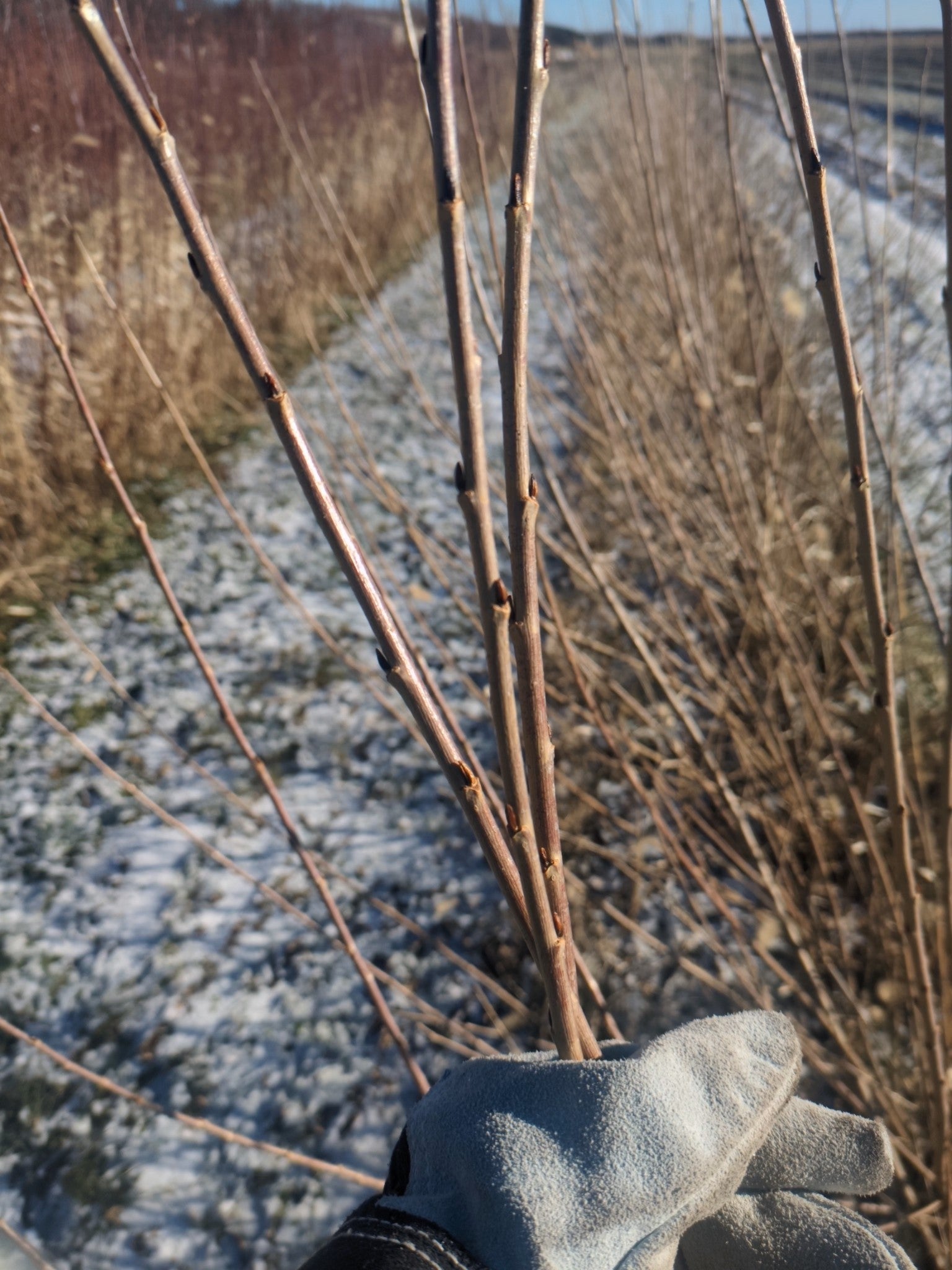Special Notes: Most used for living snow fences, riparian buffers, basketry, and streambank restoration. Female. Not known to be pollinated under field conditions. Brown bark when young, turning green and smooth with age; yellow-orange buds in winter.